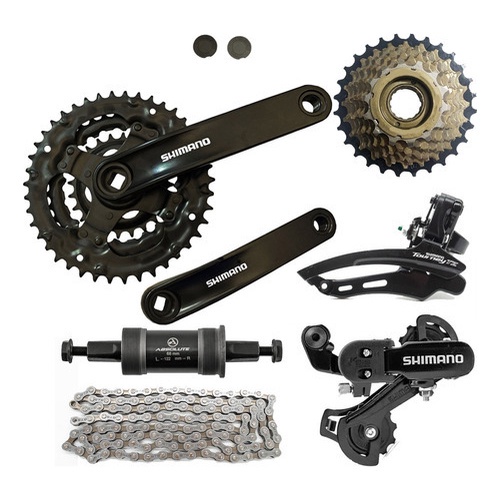 - KIT COM SUPER CUSTO BENEFICIO - KIT PERFEITO PARA SEU PEDAL - PEÇAS DE QUALIDADE - PRODUTO COM NOTA FISCAL - KIT 6 PEÇAS - ENVIO IMEDIATO KIT RELAÇÃO PEDIVELA SHIMANO+CAMBIO DIANTEIRO E TRASEIRO SHIMANO+ CORRENTE + CATRACA+ MOVIMENTO CENTRAL ABSOLUTE 1°Pedivela Shimano Tourney Ty301 42/34/24 REDUZIDO - Modelo Tourney TY301 REDUZIDO - Acompanha tampa do braço - Proteção em volta pedivela - Utiliza Movimento Central 122 ponta quadrada - Compatível com 8 velocidades - Engrenagem com 24X34X42 Dentes - Comprimento do Braço 170mm - Coroas em Aço - Peso 940 gramas 2°CÂMBIO DIANTEIRO SHIMANO TZ500 Modelo: Tourney FD-TZ500 - Abraçadeira 31.8mm - Fabricado em aço - Trocas de marchas precisas - Compatível com alavancas indexadas e não indexadas - Compatível com sistema de transmissão 6 e 7 velocidades - Compatível com pedivela 22/24/42 dentes - Peso aprox: 135g 3°Câmbio Traseiro Shimano Tourney Rd-tz31-a 6/7 Velocidades Marca: Shimano Série: Tourney Modelo: RD-TZ31 Para 6 e 7 Velocidades Sem gancheira Material: Alumínio e Aço Peso aprox: 270g 4° CORRENTE 6 / 7 VELOCIDADES - Cor: Prata - Medida: 1/2'X 3/32X116 - INDEX 5° Catraca Roda Livre 7 Velocidades Com Rosca 14/28 Dentes Fabricante: Xindu Modelo: 14/28 dentes com Rosca Aplicação: 7 Marchas - 21 Velocidades Peso: 418g 6°Movimento Cetral 122X34,7 ABSOLUTE (DIFERENCIAL)