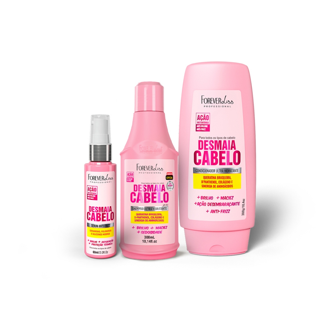 O Kit Desmaia Cabelo Shampoo Condicionador e Sérum Forever Liss é a solução que você procurava para deixar os seus cabelos mais bonitos e saudáveis. O Shampoo Desmaia Cabelo foi especialmente desenvolvido para limpar sem agredir os fios. Além disso, ele proporciona hidratação logo na primeira etapa da lavagem. Enriquecida com Queratina Brasileira, D’Pantenol, Colágeno e Sinergia de Aminoácidos, o Condicionador Desmaia Cabelo tem o poder de nutrir e hidratar profundamente os fios, proporcionando proteção, maciez, redução do volume, efeito anti-frizz e brilho extremo, resultando em cabelos mais alinhados, bonitos e com aparência saudável. Para finalizar, o Sérum Desmaia Cabelo, composto por silicones multifuncionais, ceramidas e polímeros, cria sobre os fios uma película protetora que protege do calor do secador ou chapinha. Indicação: Indicado para todos os tipos de cabelos, principalmente os ressecados, com frizz e volume em excesso. Modo de uso: 01. Comece a lavagem com o Shampoo Desmaia Cabelo massageando a primeira vez, para retirar resíduos que não permitem a completa formação da espuma. 02. Enxágue e repita a aplicação do Shampoo Desmaia Cabelo, em movimentos circulares suaves, com as pontas dos dedos no couro cabeludo. 03. Aguarde cerca de 3 minutos para que o produto possa penetrar nos cabelos. 04. Enxágue bastante até remover completamente o shampoo. 05. Retire o excesso de água dos cabelos. 06. Aplique o Condicionador Desmaia Cabelo nos cabelos úmidos, massageando mecha por mecha enluvando. 07. Deixe agir por 2 minutos. 08. Enxague os cabelos e retire o excesso de água. 09. Aplique algumas gotas do Sérum Desmaia Cabelo sobre a palma da mão, espalhando uniformemente sobre os fios. 10. Deixe secar naturalmente, ou finalize como desejar. Contém: 01 – Shampoo Desmaia Cabelo 300ml 01 – Condicionador Desmaia Cabelo 300g 01 – Sérum Desmaia Cabelo 60ml Precauções: Manter em temperatura ambiente, em local seco e ao abrigo de luz. Uso externo adulto. Em caso de contato acidental com os olhos, enxaguar abundantemente. Havendo irritação, suspenda o uso. Caso a irritação persista, procure orientação médica. Não ingerir. Manter fora do alcance de crianças. Principais Dúvidas: 01. Qual o pH dos produtos do Kit Desmaia Cabelo Shampoo Condicionador e Sérum Forever Liss? R. O pH dos produtos do Kit Desmaia Cabelo Shampoo Condicionador e Sérum Forever Liss são: Shampoo Desmaia Cabelo: 4,5 - 5,5. Condicionador Desmaia Cabelo: 3,8 - 5,2. Sérum Desmaia Cabelo: 3,8 - 5,2. 02. Com qual frequência posso utilizar o Kit Desmaia Cabelo Shampoo Condicionador e Sérum Forever Liss? R. Você pode utilizar os produtos deste kit de 2x a 3x por semana. 03. Gestantes e lactantes podem utilizar? R. Não há contraindicações, porém em caso de dúvidas o médico deverá ser consultado. 04. Quem tem progressiva pode utilizar o Kit Desmaia Cabelo Shampoo Condicionador e Sérum Forever Liss? R. Sim. Os produtos são compatíveis com todos os tipos de química. 5. Em que etapa da lavagem dos cabelos devo utilizar o condicionador? R. A ordem correta para utilização é primeiro o shampoo, depois a máscara (caso utilize no dia), e depois o condicionador. 6. O Sérum Desmaia Cabelo fornece proteção até quantos graus? R. Este sérum protege os cabelos até a temperatura de 200 ºC.