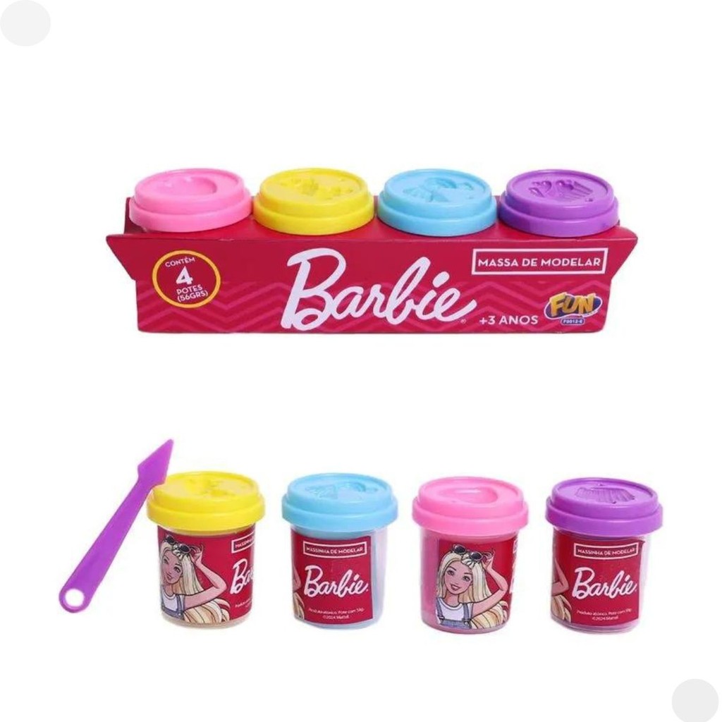 DESCRIÇÃO DO PRODUTO Massinha De Modelar Da Barbie Com 4 Potes De 50g Fun Cor Colorido. Para alegrar as pequenas, uma surpresa incrível da Barbie. Massinha com 4 Potes de 50g vai encantar as meninas que adoram a Barbie e gostam de brincar de modelar. O kit inclui quatro potes de massinha (amarela, azul, lilás e Pink) com 50 gramas cada para as crianças explorarem a imaginação. Os pequenos experimentam situações, fazem descobertas, inventam histórias e aprendem muito enquanto estão brincando. Habilidades como a concentração e a atenção também são desenvolvidas com as brincadeiras. CARACTERÍSTICAS TÉCNICAS: Conteúdo da Embalagem: 4 potes de massa de modelar Dimensões Aproximadas do Produto: 9 cm x 7 cm x 24 cm (Altura x Largura x Comprimento/Profundidade). Dimensões Aproximadas da Embalagem: 9 cm x 7 cm x 24 cm (Altura x Largura x Comprimento/Profundidade). Material/Composição: Trigo, água, pigmento e plástico Idade Mínima Recomendada: A partir de 3 anos Participantes: A partir de 1 pessoa Alimentação: Não se aplica Marca: Fun Referência: F0012-6 Outras informações: As cores podem variar entre as imagens mostradas acima e o produto. Imagens meramente ilustrativas. Aviso: As informações e imagens divulgadas são de total responsabilidade do fabricante/fornecedor. Produto lacrado e disponível a pronta entrega para todo Brasil! APROVADO PELO INMETRO