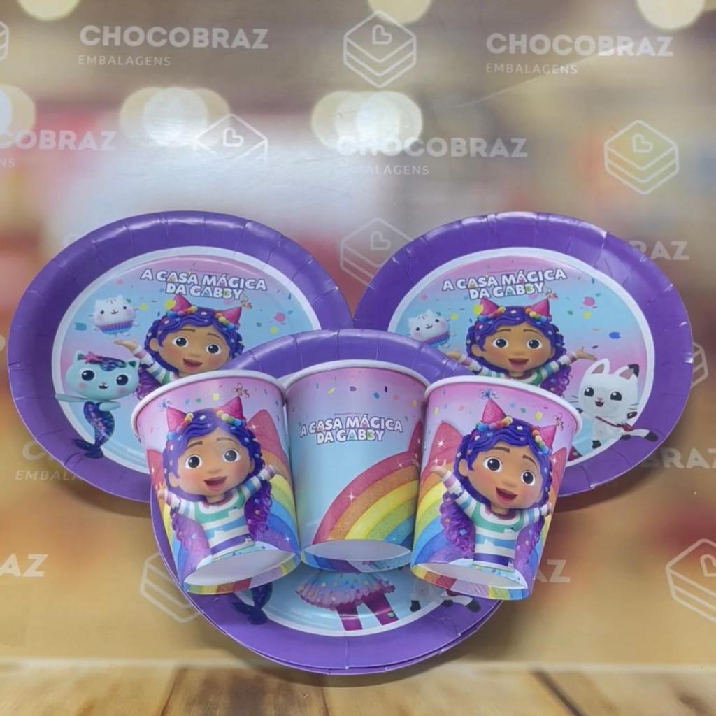 TÍTULO DO PRODUTO 😻 KIT FESTA A CASA MÁGICA DA GABBY (16 PRATOS + 16 COPOS DESCARTÁVEIS 200 ML PAPEL) - FESTCOLOR - CELEBRAÇÃO MÁGICA E FELINA 🌈