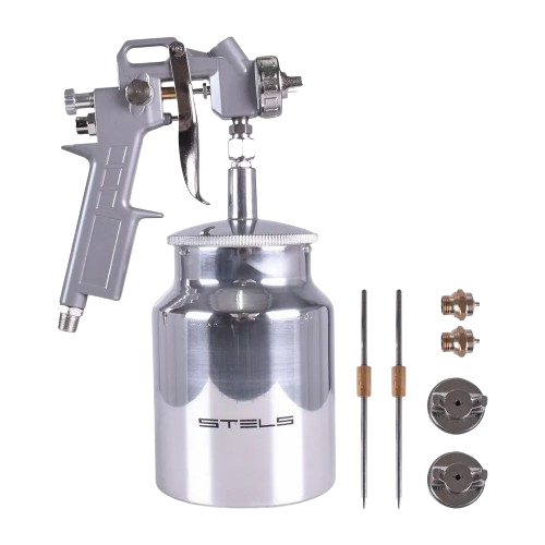 PISTOLA DE PINTURA COM TANQUE ALTO, ALIMENTAO POR GRAVIDADE 1000ML DIMETRO DOS BICOS 1,2 1,5 1,8MM ROSCA 1/4 NPT STELS - 1 Pistola de Pintura Stels por Gravidade - 1 Caneca em Alumínio 1000 ml