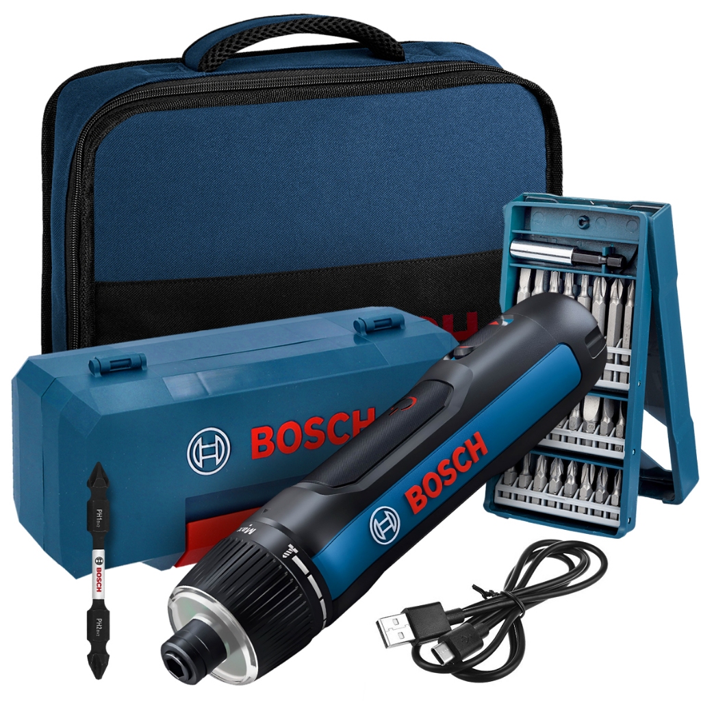 Componentes incluídos na embalagem: - 01 Bosch Go 3; - 01 Bit ponta dupla impact control; - 01 Cabo USB-C; - 01 Estojo para Bosch GO; - 16 Pontas de 25mm: PH1 / PH2 / PH3 / PZ1 / PZ2 / PZ3 / S4,5 / S5,5 / S8 / HEX 4mm / HEX 5mm / HEX 6mm / T15 / T20 / T25 / T30; - 08 Pontas 50mm: PH1 / PH2 / PH3 / S4,5 / S5,5 / T15 / T20 / T25; - 01 Suporte universal magnético.