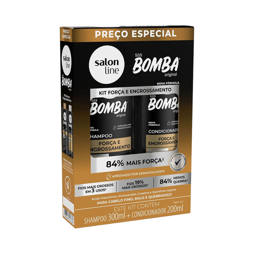 KIT SALON LINE SHAMPOO + CONDICIONADOR SOS BOMBA FORÇA E ENGROSSAMENTO ====================================================================== O Kit Salon Line Shampoo + Condicionador SOS Bomba Força e Engrossamento é perfeito para quem busca cabelos mais encorpados e fortes. Formulado para reduzir a quebra dos fios em até 89%, ele fortalece a fibra capilar desde a raiz. Com Ácido Hialurônico, Aminoácidos e Creatina, o kit promove intensa revitalização capilar de forma eficaz. Veja a diferença na espessura do seu cabelo a partir da terceira aplicação. Transforme seus fios finos e quebradiços em cabelos densos e saudáveis. FORTALECIMENTO CAPILAR Com Ácido Hialurônico, Aminoácidos e Creatina, o kit promove intensa revitalização capilar de forma eficaz. RESULTADOS VISÍVEIS RÁPIDOS Veja a diferença na espessura do seu cabelo a partir da terceira aplicação. Transforme seus fios finos e quebradiços em cabelos densos e saudáveis. MODO DE USO =========== Para obter melhores resultados, use o shampoo e condicionador em conjunto para fortalecer e encorpar os fios. Aplique o shampoo sobre o cabelo molhado, massageando suavemente o couro cabeludo. Enxágue completamente e repita a aplicação se necessário, para garantir a limpeza total. Aplique o condicionador nos fios úmidos, distribuindo por todo o comprimento e pontas. Deixe o condicionador agir por alguns minutos e enxágue bem para finalizar. APLICAÇÃO Aplique o shampoo sobre o cabelo molhado, massageando suavemente o couro cabeludo. ENXÁGUE Enxágue completamente e repita a aplicação se necessário, para garantir a limpeza total. CONDICIONAMENTO Aplique o condicionador nos fios úmidos, distribuindo por todo o comprimento e pontas. FINALIZAÇÃO Deixe o condicionador agir por alguns minutos e enxágue bem para finalizar. CARACTERÍSTICAS E BENEFÍCIOS DO KIT SALON LINE SHAMPOO + CONDICIONADOR SOS BOMBA FORÇA E ENGROSSAMENTO ====================================================================================================== O kit é enriquecido com ativos potentes que restauram os fios, proporcionando uma aparência mais densa. Contém Queratina Vegetal que fortalece os cabelos enquanto restaura sua elasticidade natural de maneira eficiente. Sua fórmula especialmente desenvolvida confere corpo aos cabelos finos e quebradiços sem danificar. Oferece hidratação intensa aos fios, mantendo-os sempre saudáveis e radiantes após cada aplicação. Testes rigorosos garantem que o produto seja seguro para todos os tipos de cabelo sem causar irritações. ATIVOS PODEROSOS Contém Queratina Vegetal que fortalece os cabelos enquanto restaura sua elasticidade natural de maneira eficiente. EFEITO VOLUMOSO Sua fórmula especialmente desenvolvida confere corpo aos cabelos finos e quebradiços sem danificar. HIDRATAÇÃO PROFUNDA Oferece hidratação intensa aos fios, mantendo-os sempre saudáveis e radiantes após cada aplicação. DERMATOLOGICAMENTE TESTADO Testes rigorosos garantem que o produto seja seguro para todos os tipos de cabelo sem causar irritações. ESPECIFICAÇÕES TÉCNICAS ======================= O kit inclui um shampoo de 300 ml e um condicionador de 200 ml, ideal para tratamento contínuo. Tamanho do Shampoo: 300 ml Tamanho do Condicionador: 200 ml Cores: Preto com detalhes dourados Tipos de Cabelos: Cabelos Finos Peso: Não especificado Altura: Não especificada SOBRE A MARCA SALON LINE ======================== A Salon Line é uma marca reconhecida no mercado de beleza, oferecendo produtos de qualidade para cuidados capilares. Seus produtos são desenvolvidos com tecnologia avançada para atender diferentes tipos de cabelo, garantindo eficácia e segurança. A marca investe em pesquisa e desenvolvimento para trazer inovações aos seus consumidores. Oferece uma linha completa de produtos capilares que atendem diferentes necessidades. Todos os produtos são dermatologicamente testados, garantindo segurança e eficácia. DESENVOLVIMENTO DE PRODUTOS A marca investe em pesquisa e desenvolvimento para trazer inovações aos seus consumidores. VARIEDADE DE PRODUTOS Oferece uma linha completa de produtos capilares que atendem diferentes necessidades. COMPROMISSO COM A QUALIDADE Todos os produtos são dermatologicamente testados, garantindo segurança e eficácia.